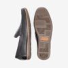 Ele possui frente do cabedal costurado a mão, solado de borracha com uma pequena faixa na cor tamarindo/ocre e bico arredondado. Também conta com palmilha macia e detalhe em metal com o logo da marca.